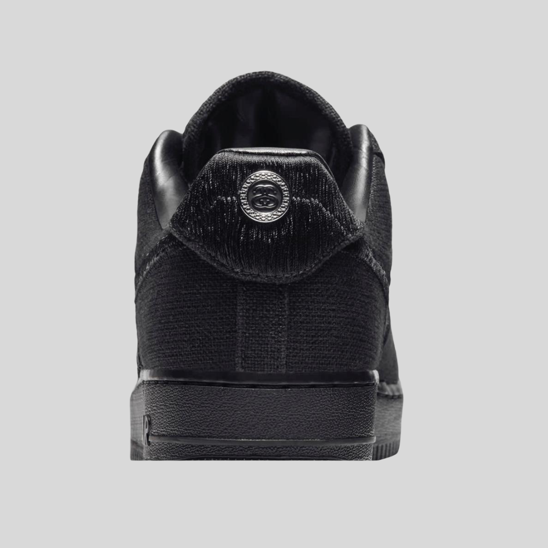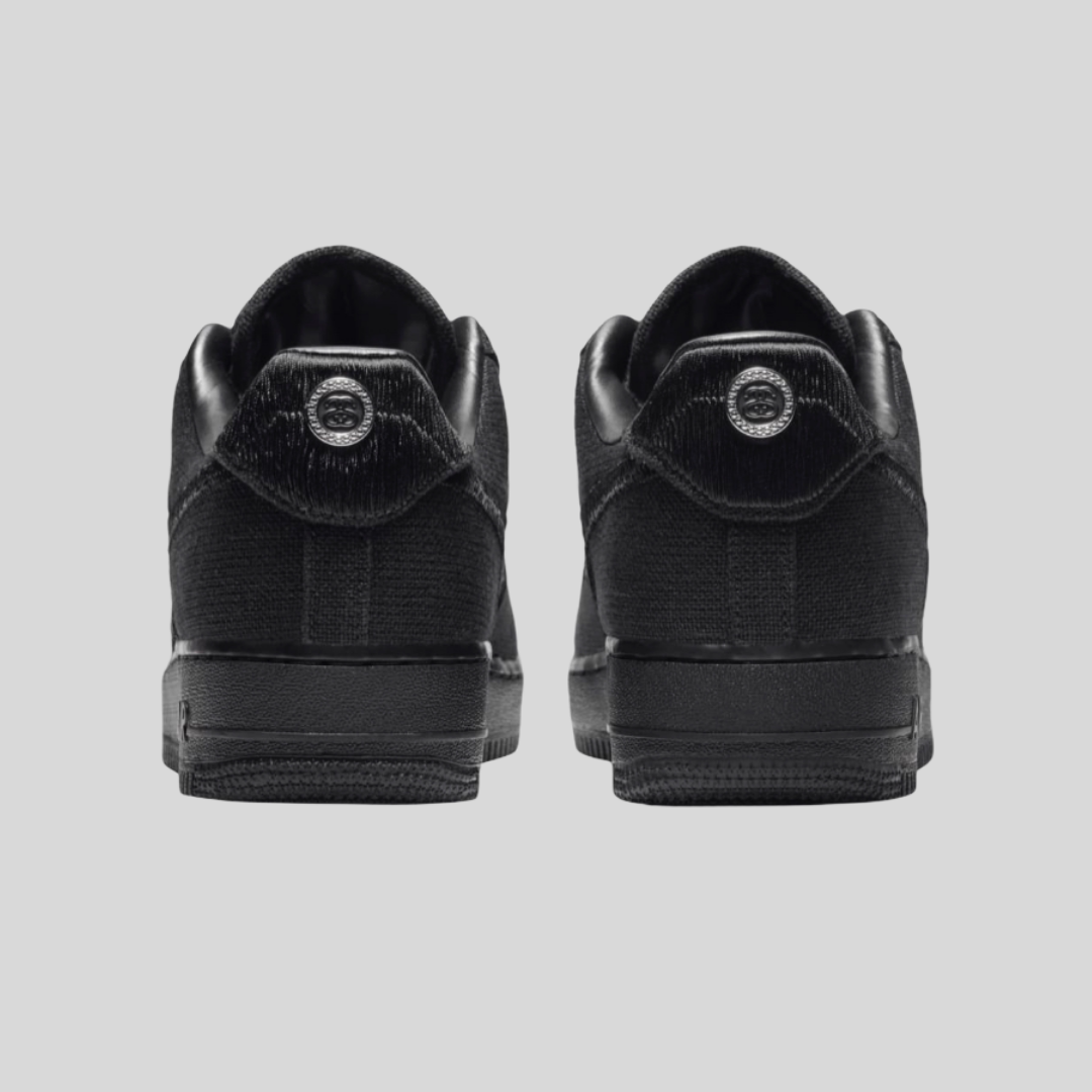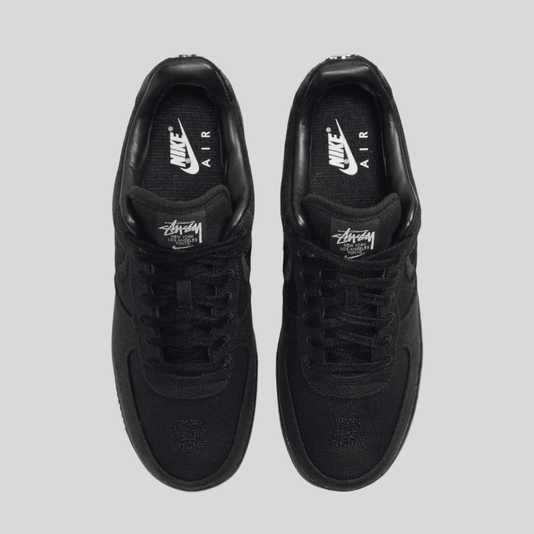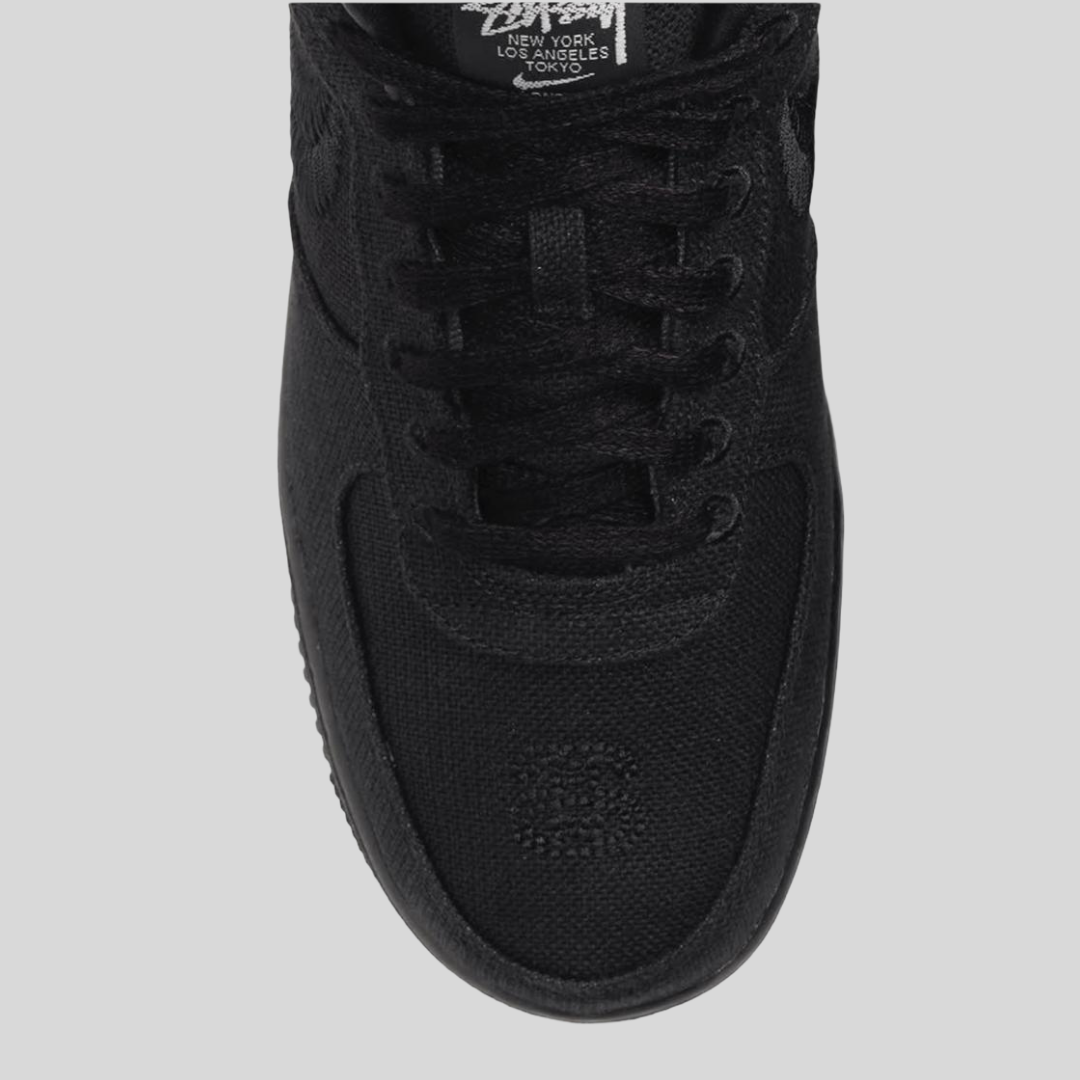 Colaboración de nike por stüssy ; modelo air force 1 , con detalles bordados como el logo de nike y de stüssy, en la parte de atrás de las zapatillas hay un símbolo metlizado y también en la lengueta el símbolo de stüssy.